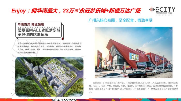 永荟广场位于广州东TOD国际交通枢纽附近(香山大道与创新大道交汇处),总建面约75万㎡大型商业综合体,对面50米即是新塘首家三甲医院南方医院增城分院,临近富士康、广汽本田等高新产业园区,周边5公里范围内为开发区知名500强企业布局,未来规划入住人口近100万人,项目落成之后会成为新塘开发区的商业核心圈。项目本身自带建面约23万㎡永旺梦乐城华南旗舰店,下楼即享缤纷生活,加上项目旁的新塘万达广场(已开业)等商业,未来将为区域带来百万消费人群。