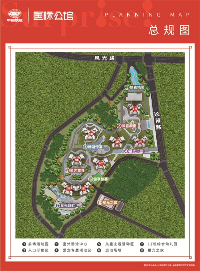 内部:12班幼儿园、社区卫生站、星光老人之家、500米环区跑道、羽毛球场、篮球场、全龄段游泳池