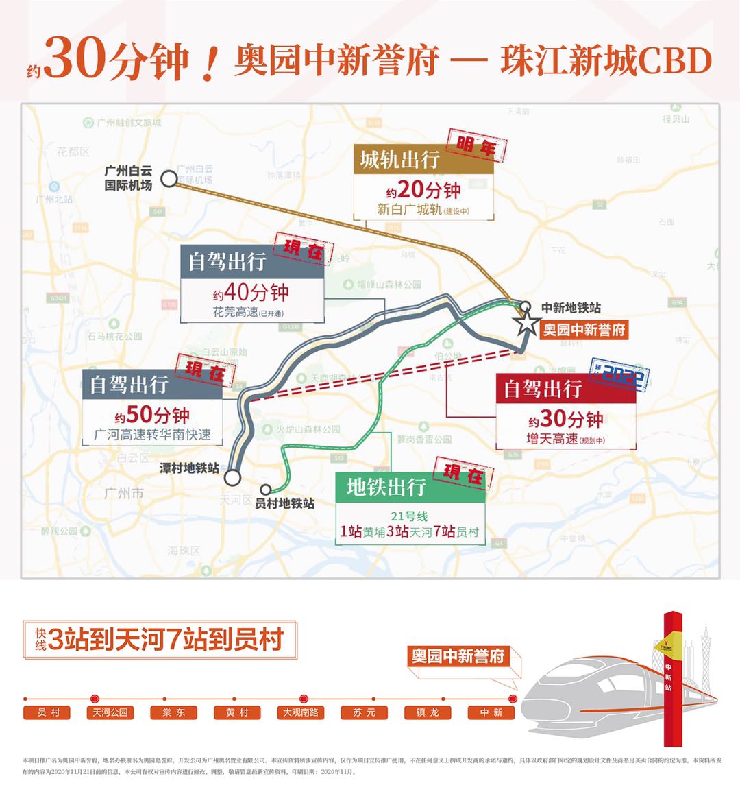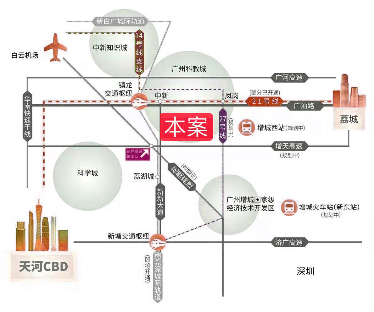 最强路网——3横2纵1地铁1城轨,多维交通环绕.地铁:地铁21号线,1站黄埔,3站天河,全能地铁盘