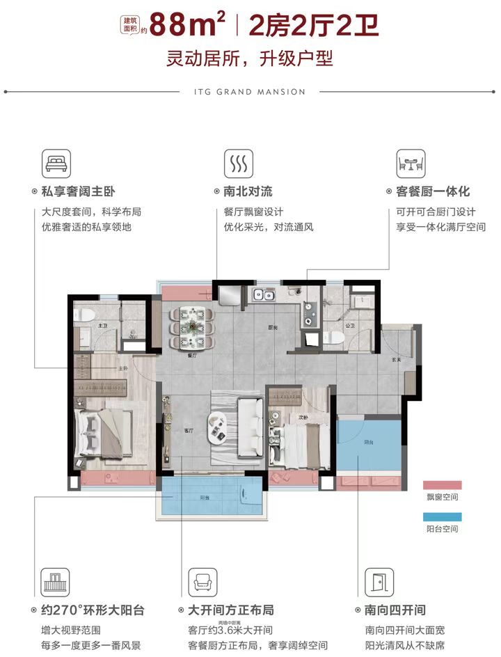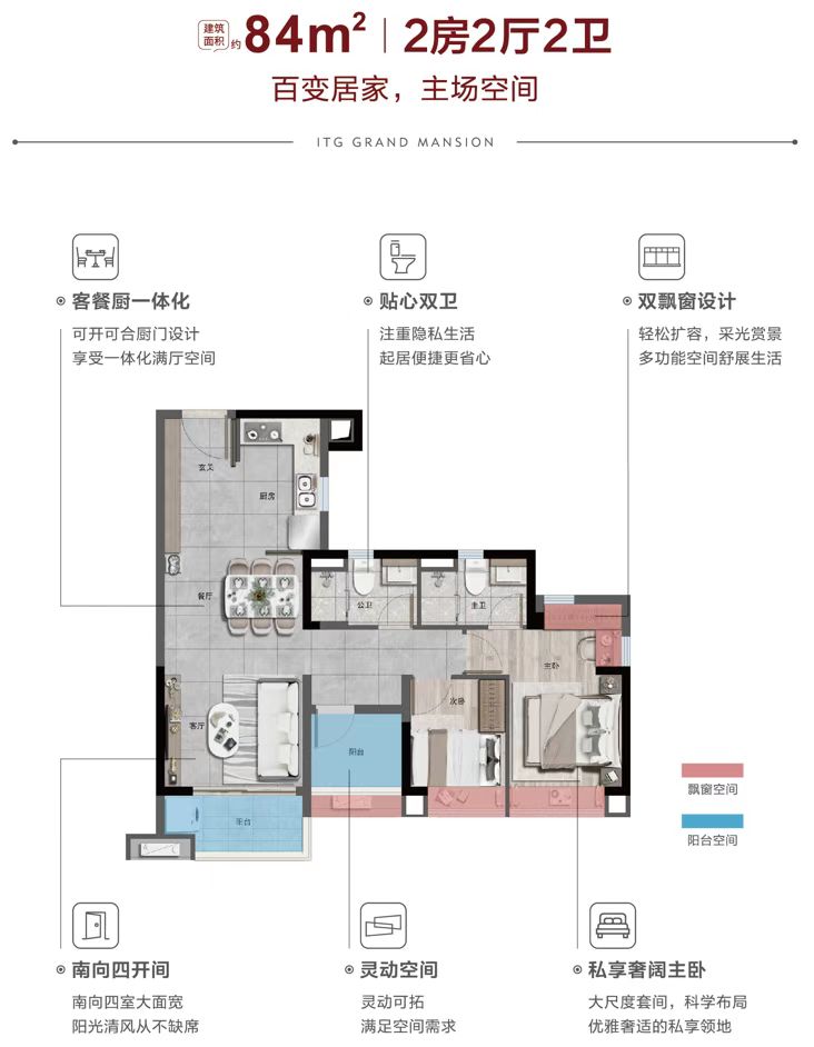 【产品】:新生代产品系代表作,4.0展蝶楼型,国际现代立面,约8.4万㎡坡地中央大园林,建面约76-103㎡轻奢阔变2-3房,餐厨一体化,局部户型次卧满飘窗赠送,约85%超高实用率