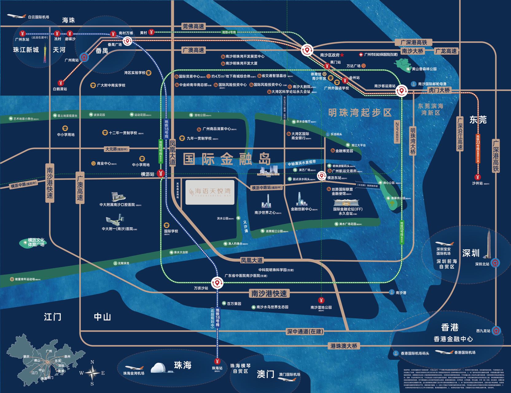 项目位于广州南沙明珠湾国际金融岛芯,全国最快地铁18号线横沥站旁(直线距离约500米),2站(快线)直达珠江新城。与国际金融永久会址IFF为邻,2KM内规划 12 所菁英教育、中大附属第一医院(在建)等2所三甲医疗、繁华地下商业广场等,坐享一站式国际化高端配套。项目推出建筑面积约90-140㎡江园奢居三至四房,南向面江,户户朝南,尽享品质生活!