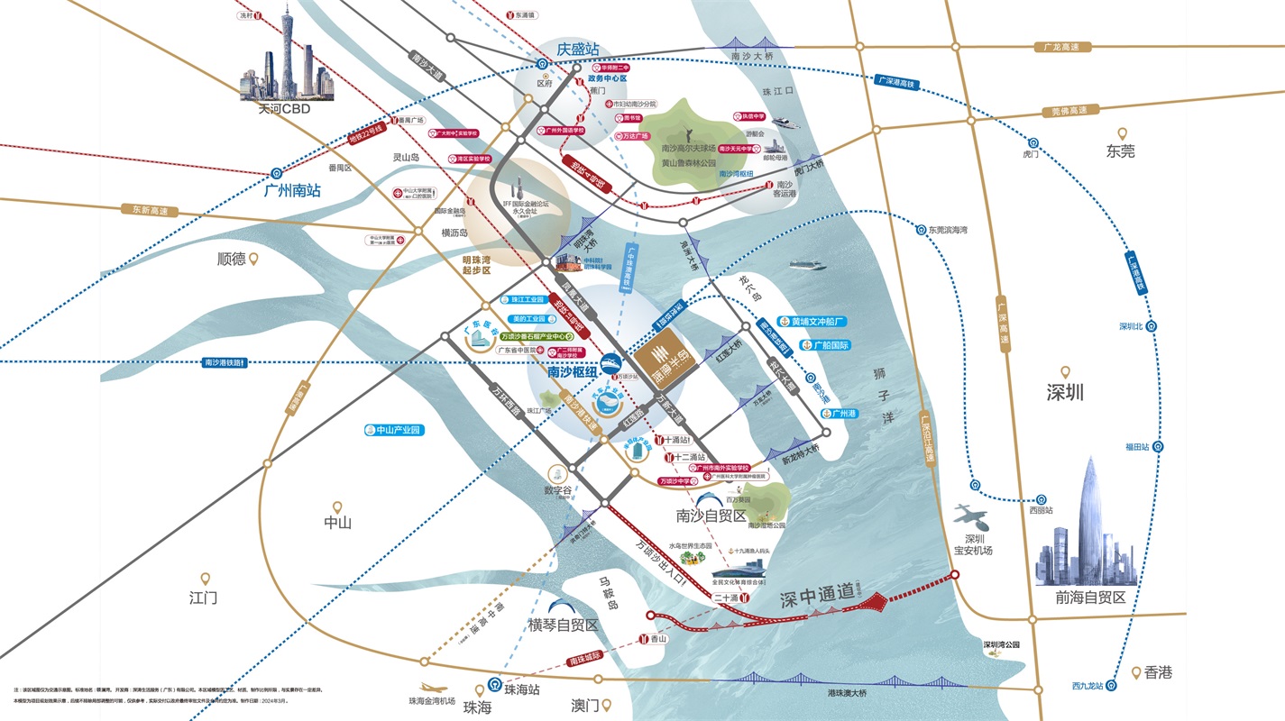 【交通 】深中通道,比深圳更近前海。一桥直连深圳宝安,价格仅为前海1/5。地铁18号线万顷沙站,7站到天河,22号线快线,4站到广州南。紧邻大湾区交通咽喉——南沙枢纽站,享3地铁+3高铁+2城轨八大轨道交汇。家门口业主楼巴无缝接驳万顷沙地铁站和天河宏发大厦。