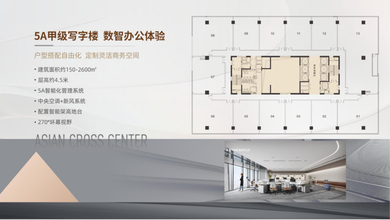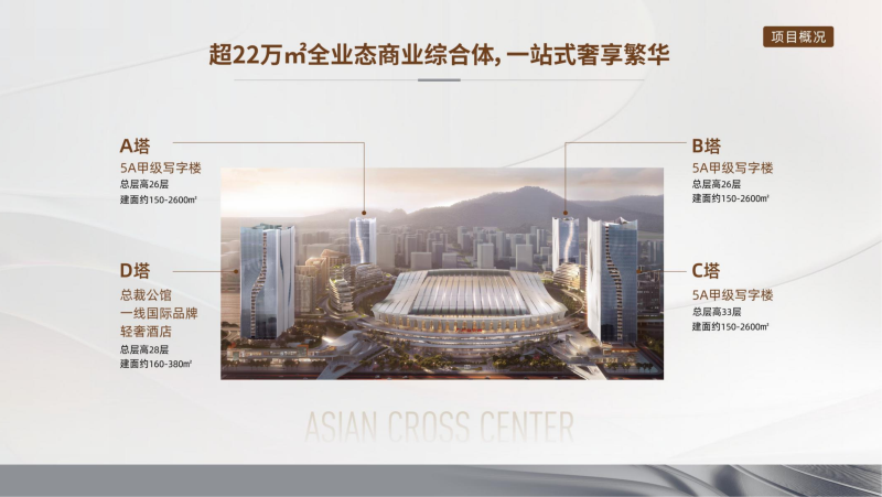 【主力产品】:约150-2600㎡ 5A甲级写字楼、约160-380㎡ 定制总裁公馆