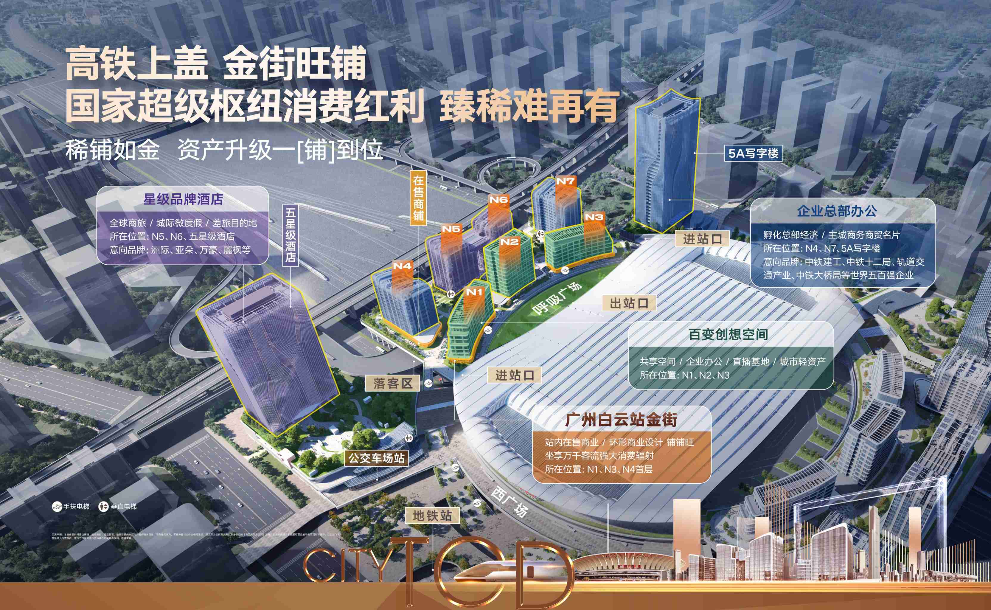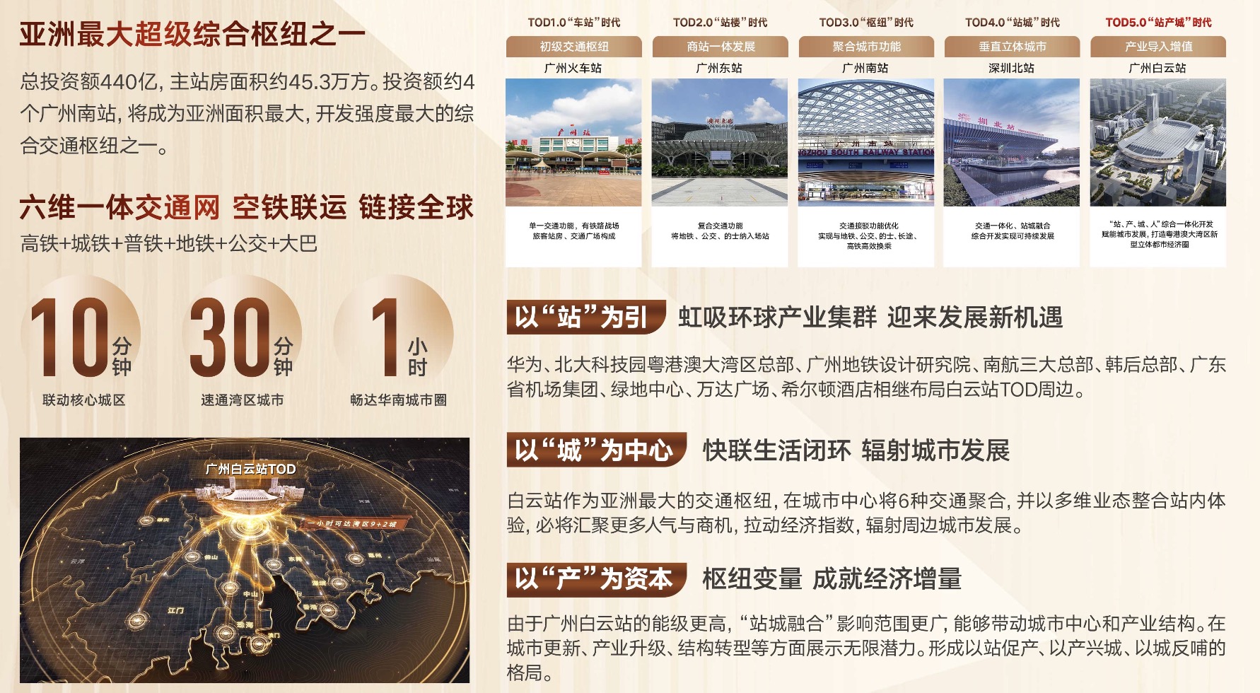 全国首创TOD5.0枢纽,亚洲最大综合交通枢纽之一,政府投资超440亿,站房总建面约45.3万平方米,超广州南站3倍投资。“站、产、城、人”于一体的新型湾区都市经济圈,实现“城市枢纽”向“枢纽城市”的跃进。“枢纽+”以白云站为核心布局,拉动时尚、设计、总部经济、数字科技产业全面发展。