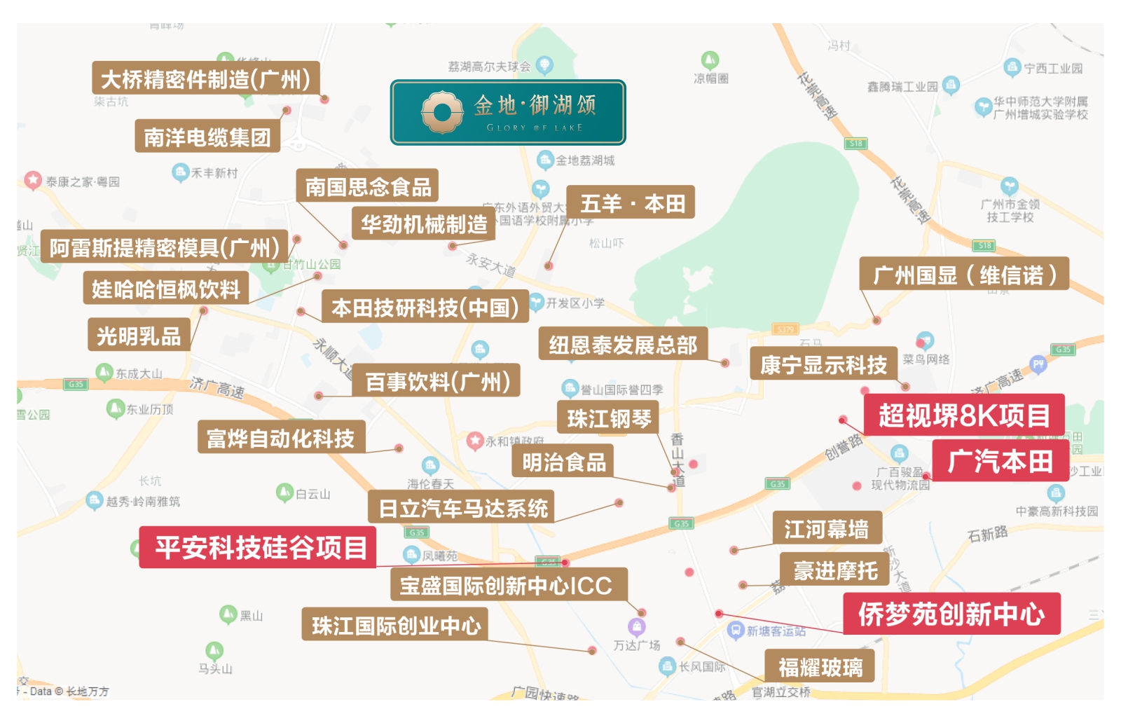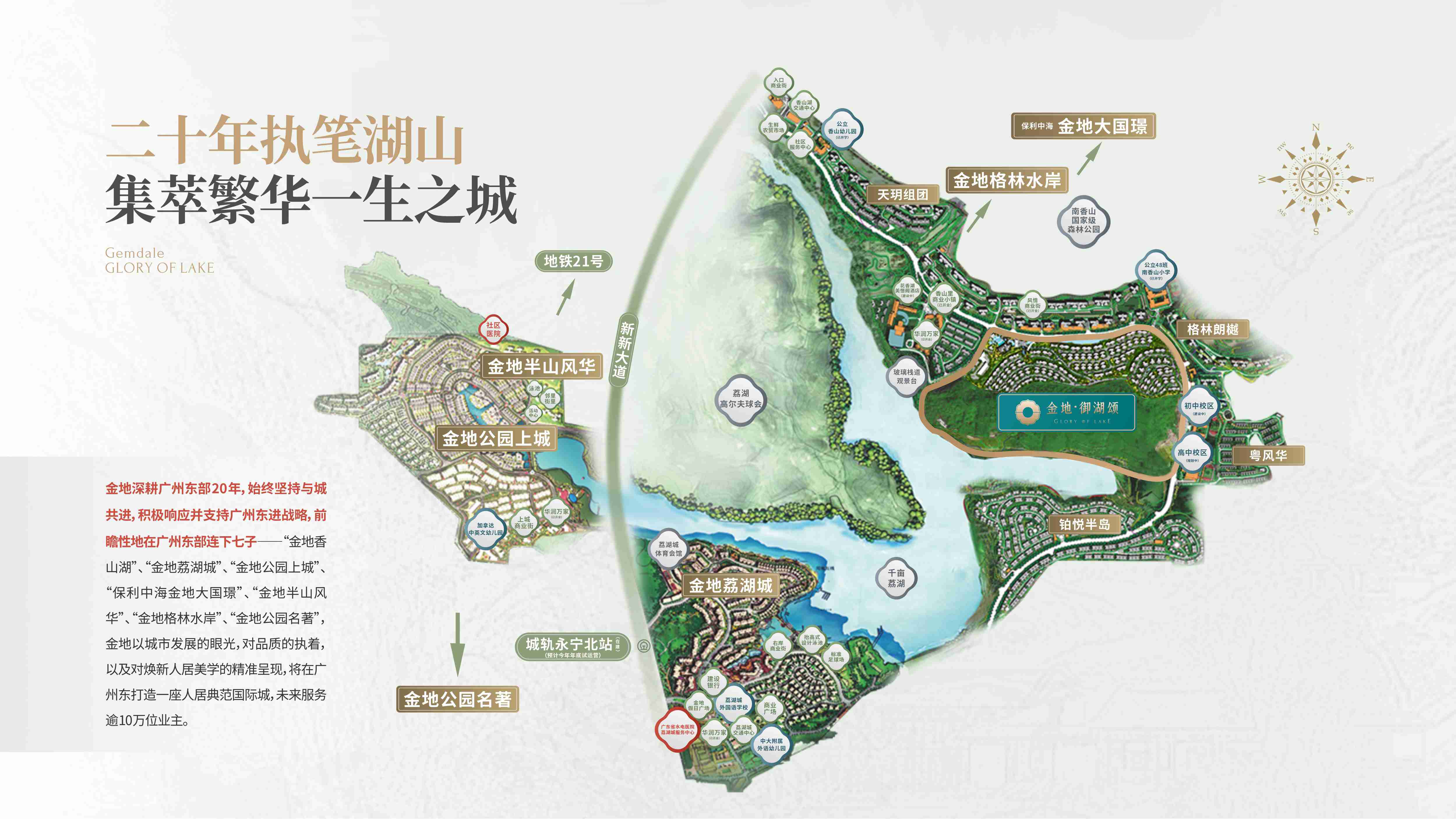 教育:配套香山幼儿园、加拿达国际双语幼儿园、中大附属荔湖城外语幼儿园、南香山小学,荔湖城外国语学校均已运营,项目内含自建初中(在建中)、高中(在建中)7大学校,15年全龄一站教育已成