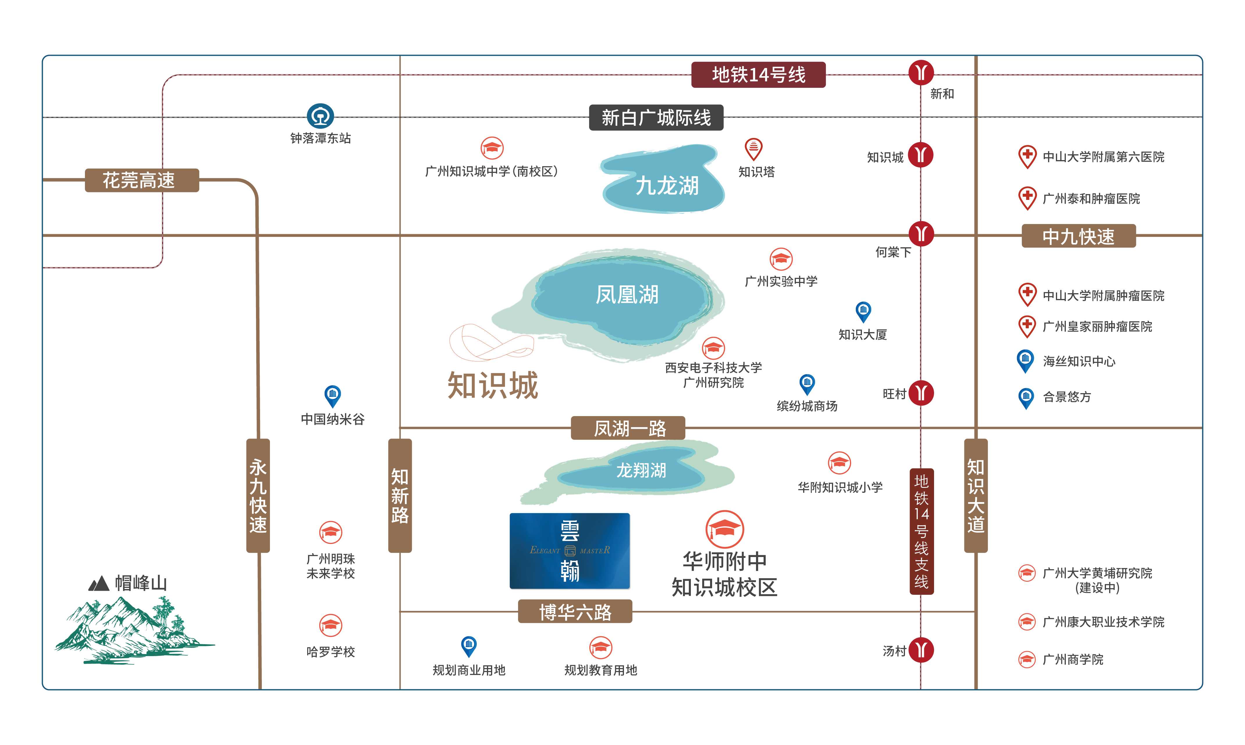 优质医疗:周边拥有中山六院知识城院区(待营业)、中山大学肿瘤医院、皇家丽肿瘤医院、泰和肿瘤医院等成熟医疗设施,悉心呵护家人健康。