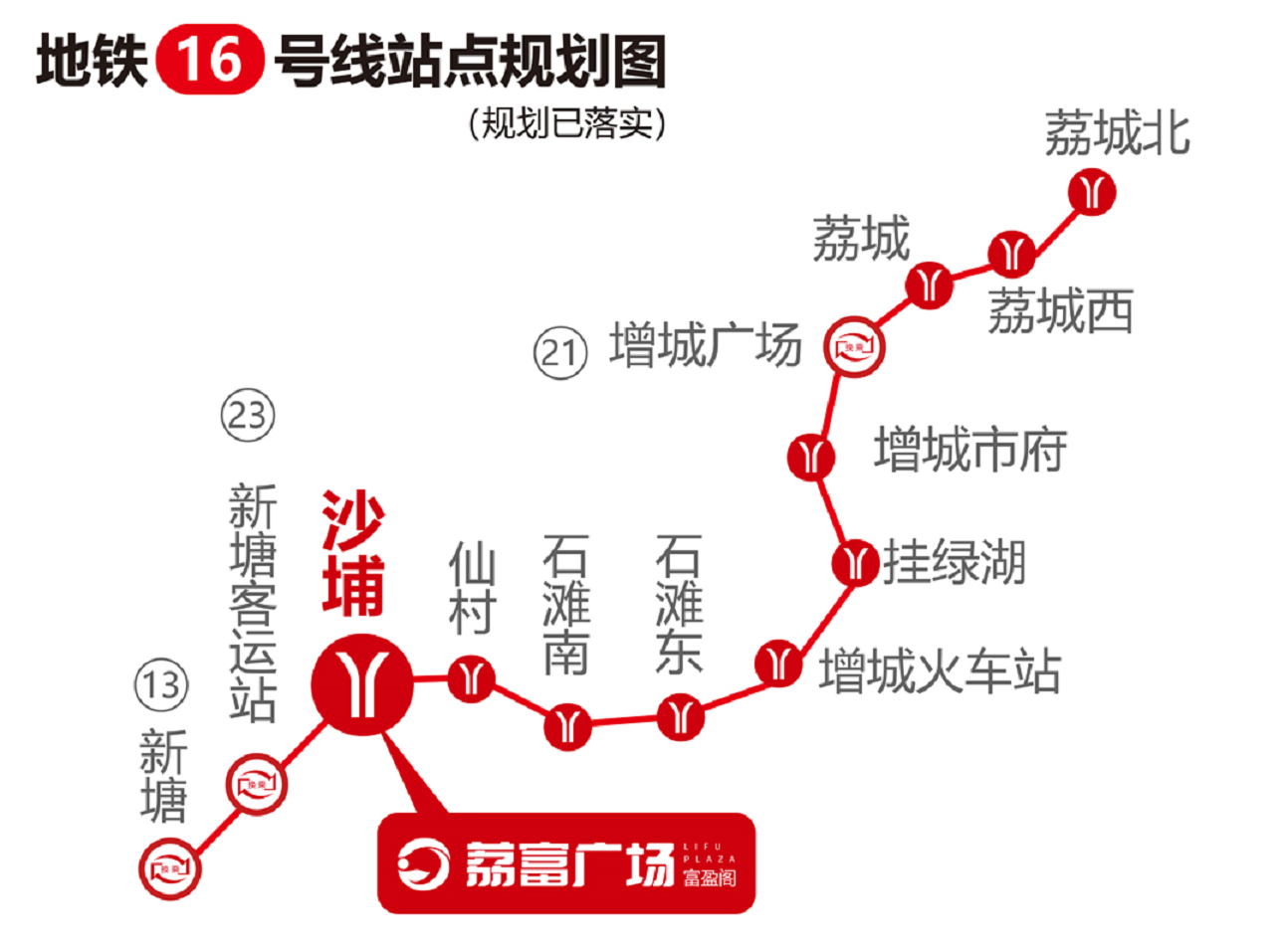 交通增速可期 地铁 16 号线规划,十六号线沙浦站约 500 米。项目更是邻近东部交通 枢纽中心,未来 16 号线 2 站转乘可换乘 9 大枢纽线,更能换乘 13 号线通达天河,价值可期。