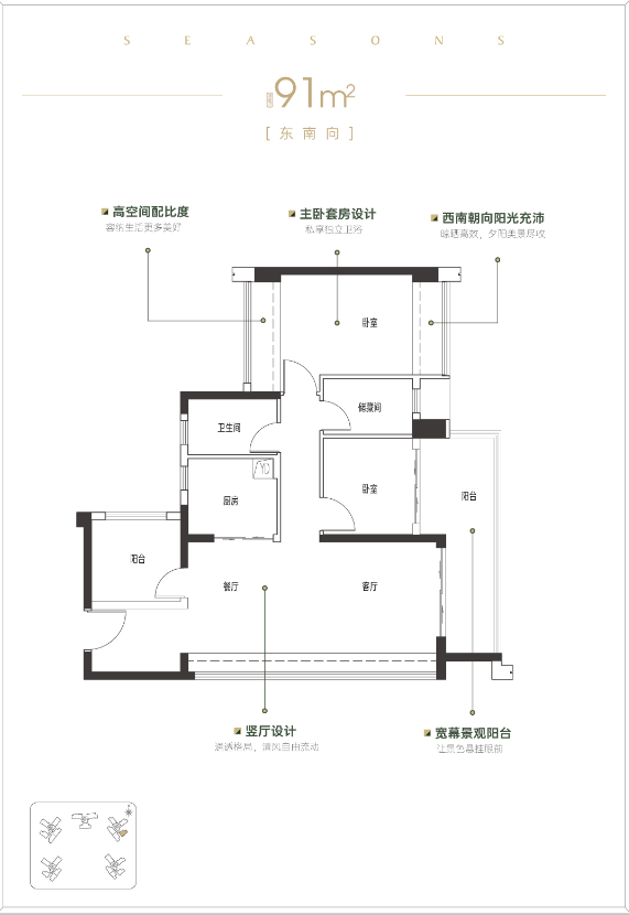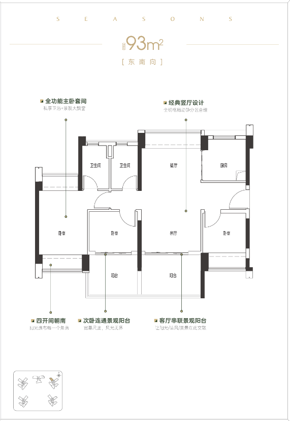 坐北朝南:四季山水位于帽峰山下,整体小区南向朝向规划,保证四季南向采光最大画;
