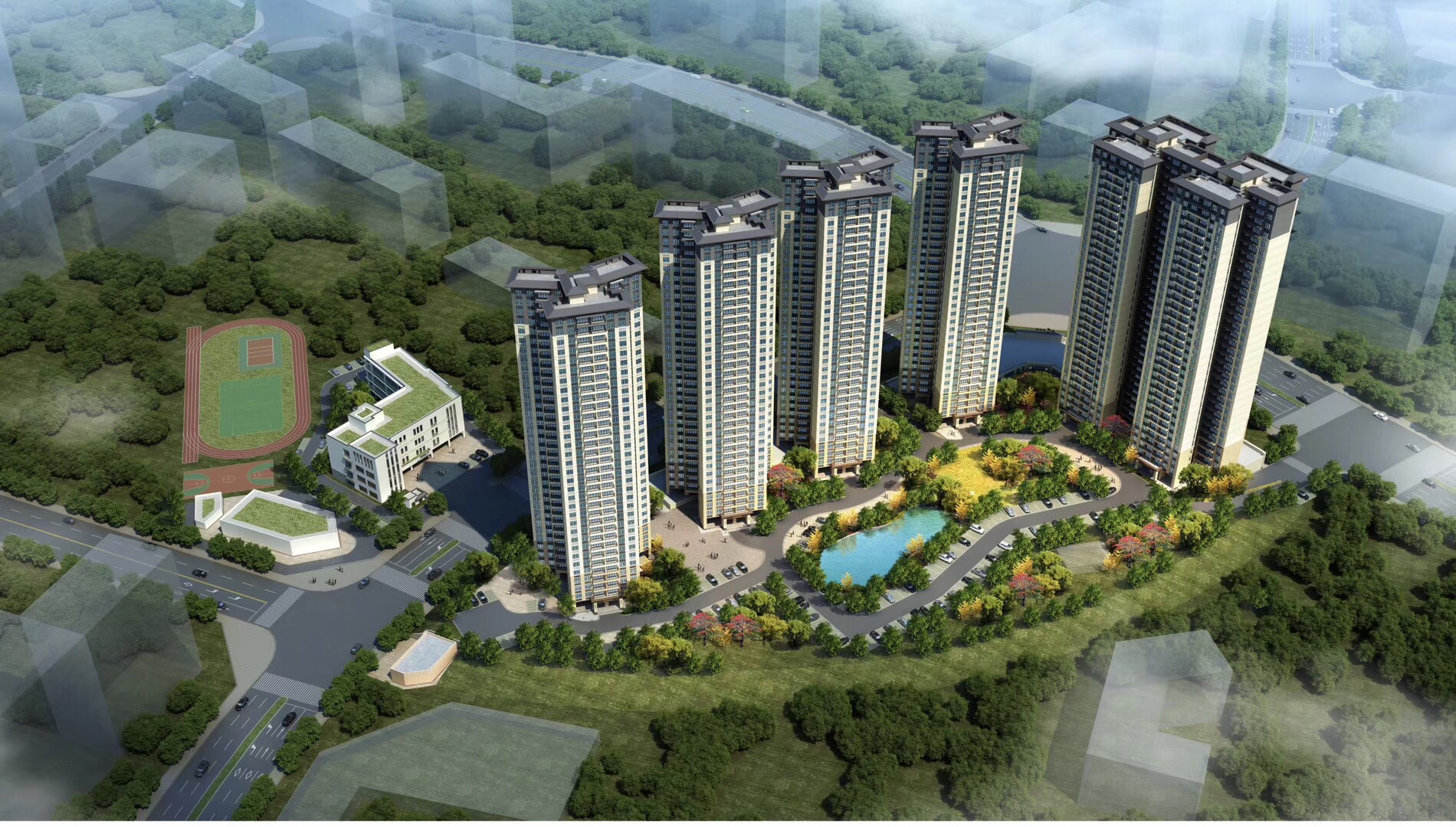 配套:幼儿园、泳池、羽毛球场、迷宫、儿童乐园、健康步道、滨河公园、篮球场、健身区
