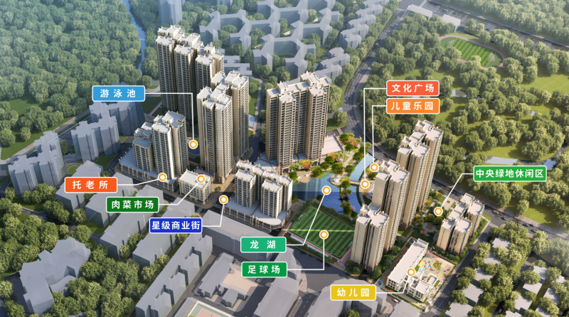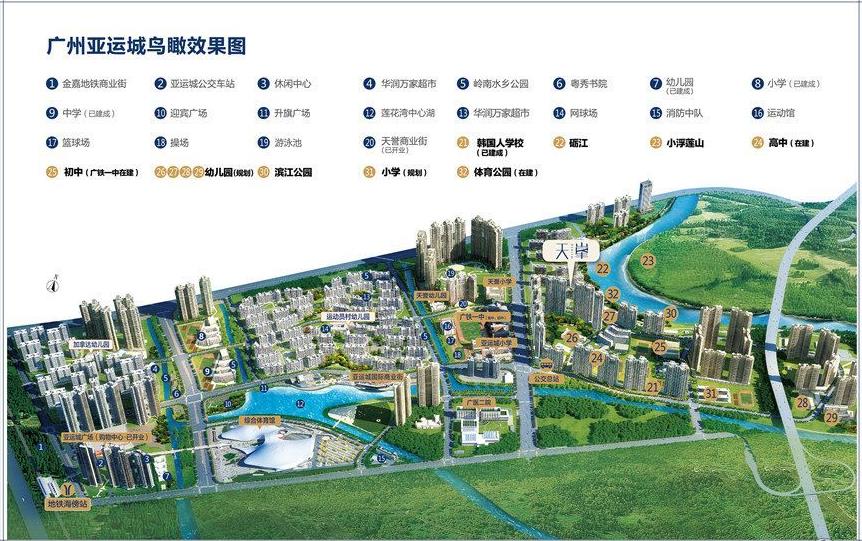 内部:超市:人人乐、华润万家 、棋牌室 、乒乓球室 、健身中心 、3000㎡双泳池 、8万方皇家园林 、健身房:力美健、云动力 、托老所 、社区居委会 、老年人服务站点 、邮政所 、沙滩排球馆 、亚运城综合体育馆 、大型农贸市场 、岭南水乡建筑群 、粤秀书院 、升旗广场 、亚运广场 、迎宾广场 、岭南滨水公园 、莲花湾
