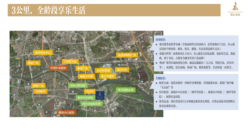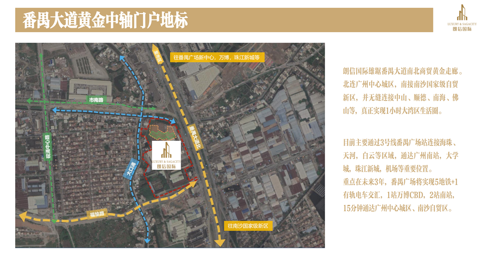 朗信国际位于城市中轴番禺大道北路上,连接番禺与南沙自贸区的门户位置,北面紧邻番禺广场、永旺梦乐城、万科里、沃尔玛等购物娱乐中心。南面通过沙湾大桥,连接南沙自贸区。西面有番禺区三甲医院——番禺中心医院。东面是18号线陇枕交通枢纽商住综合,共享未来成熟配套。