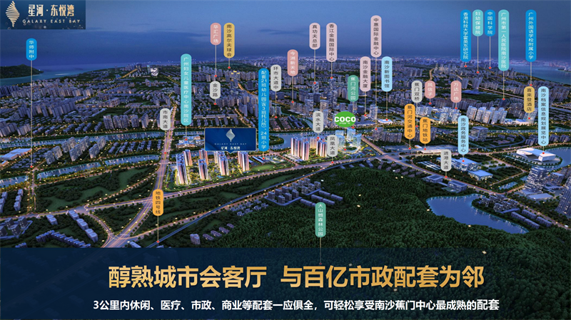 【醇熟城市会客厅】位居蕉门河中心区,距离南沙区府仅500米,3公里内集聚金融总部、万达购物中心、图书馆、美术馆、博物馆、体育馆等城市配套。