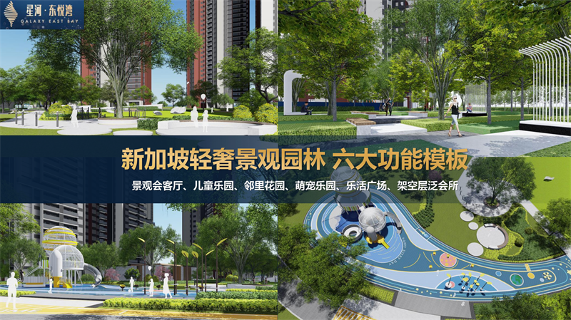 【新加坡现代园林】以乐活跑道贯穿景观会客厅、儿童乐园、邻里花园、萌宠乐园、乐活广场六大功能板块,打造富有生命力的活力社区。