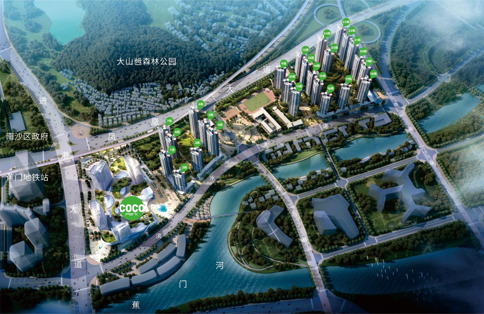 【揽山观河生态优越】背靠946万m2大山乸森林公园,优享2.3公里蕉门河生态滨水景观。有山有水,风水极佳。