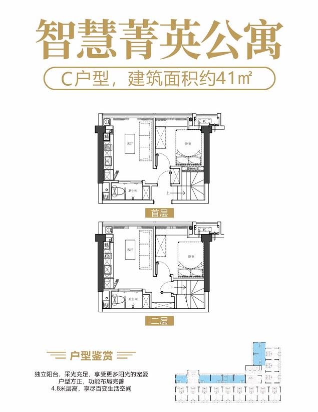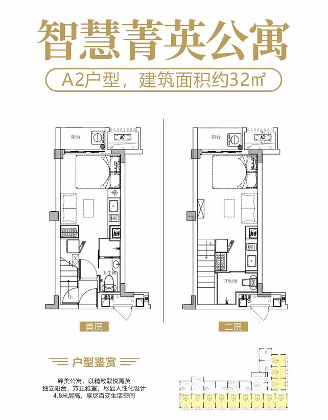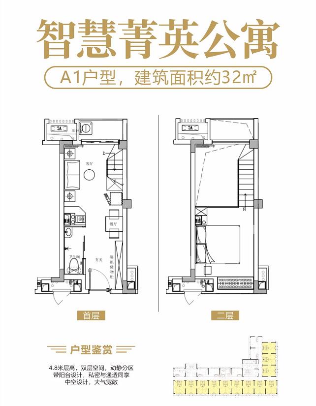 ①. 在售产品:32㎡-41㎡ 双钥匙户型,32㎡中空复式户型