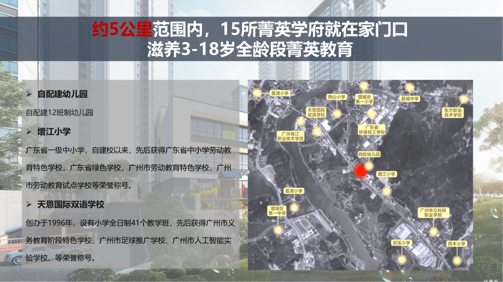 【2】 自带12班制幼儿园,近邻增江小学、天恩国际双语学校、增城二中学校等15所院校等办学历史悠久,师资稳定。