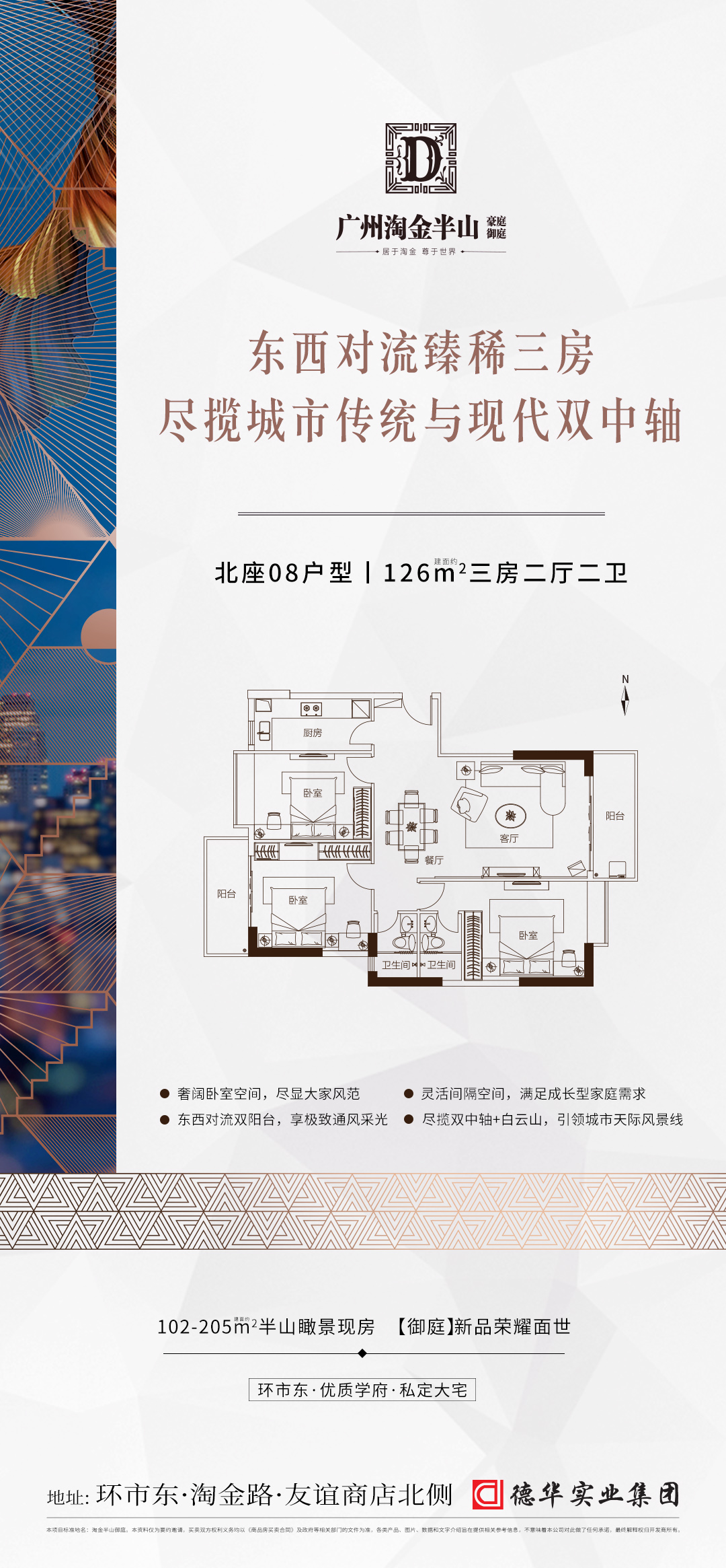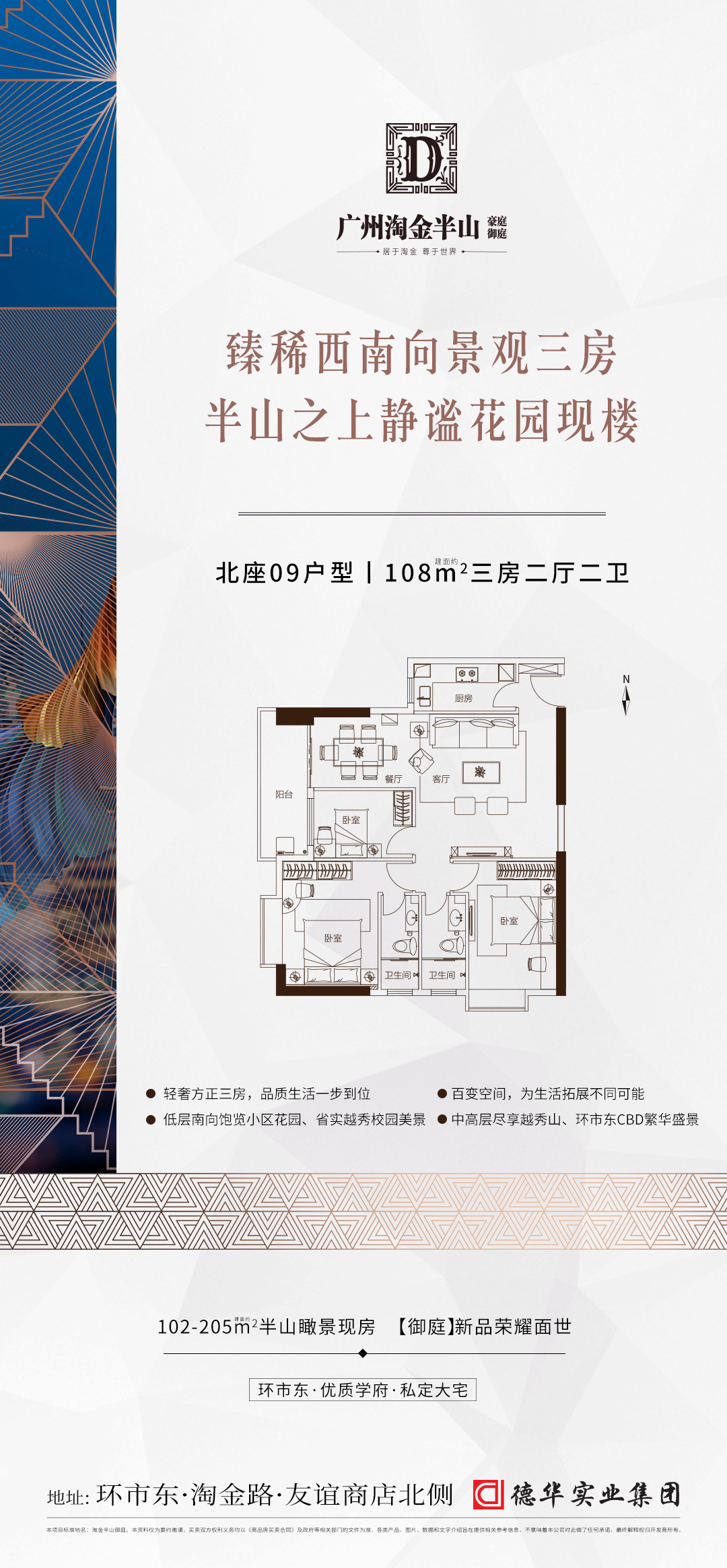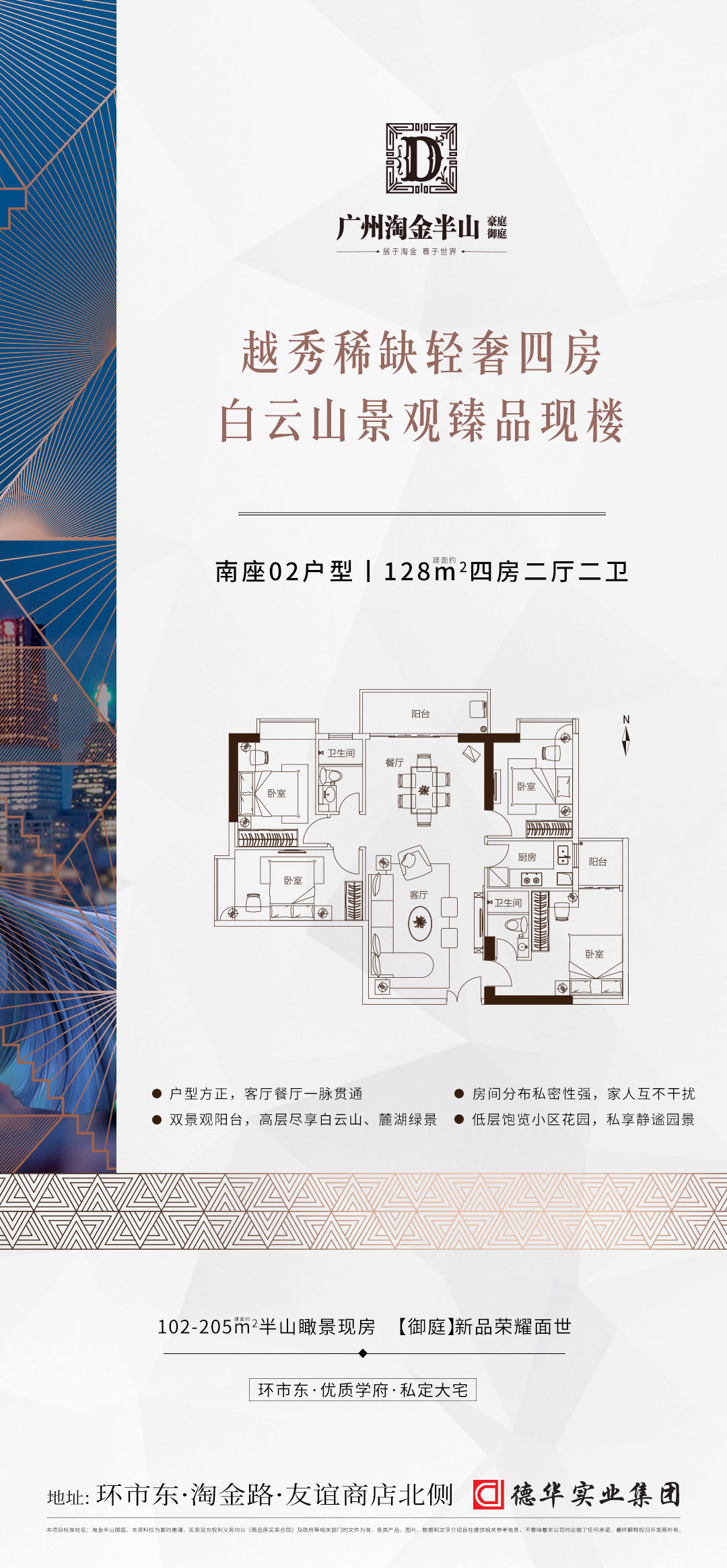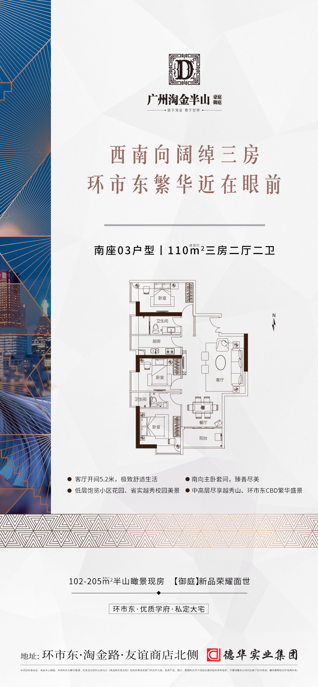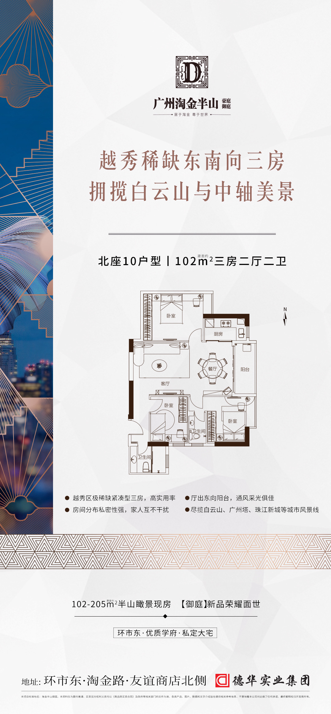 淘金半山御庭,越秀区环市东半山之上,友谊商店北侧,地铁5号线淘金站,公办九年一贯制外语(双语)【广州市华侨外国语学校】就在家门口,享执信、二中、广大附中等优质名校圈,俯瞰白云山、越秀山、城市新中轴等美景。 另外,项目周边配套十分齐全,社区内中西餐厅、粤、潮、川、湘、中西式快餐、咖啡厅、茶舍、酒吧和点心小吃等各款各式饮食,24小时均可吃喝。 项目周边有中、工、农、建、交、等银行,存、取款、转帐、理财等非常方便。小区车位配比超过1:1,可租可售,基本解决停车难题。 目前,项目主推建面约102-205㎡三至五房,高绿化率静谧花园社区,现房发售。