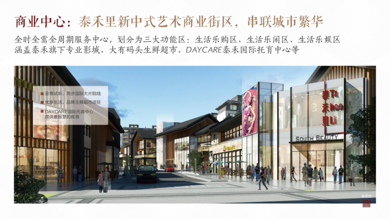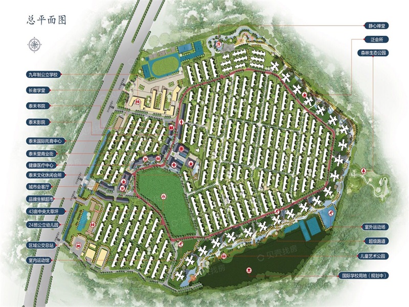 内部:24班幼儿园、中式商业街——泰禾里、生态跑道、羽毛球馆、篮球场、网球场、足球场、游泳池、24小时专业医 疗服务、长者学堂、泰禾书院、生态森林与儿童艺术公园、高端会所、星级影院