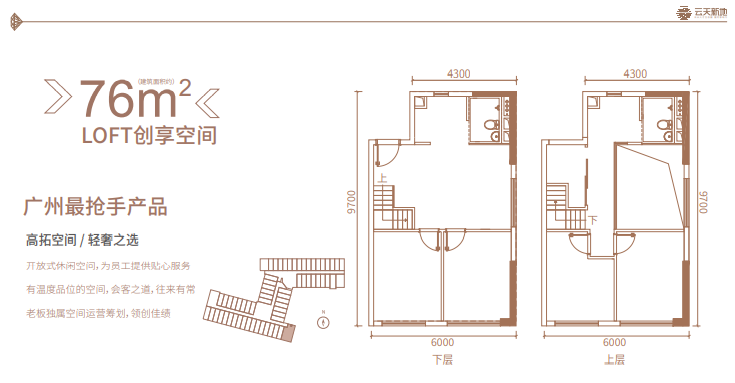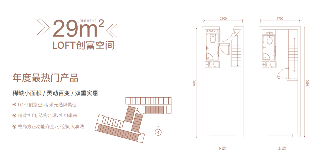 产品类型:建面27-76㎡创客空间/平层层高2.25m 复式层高4.5m