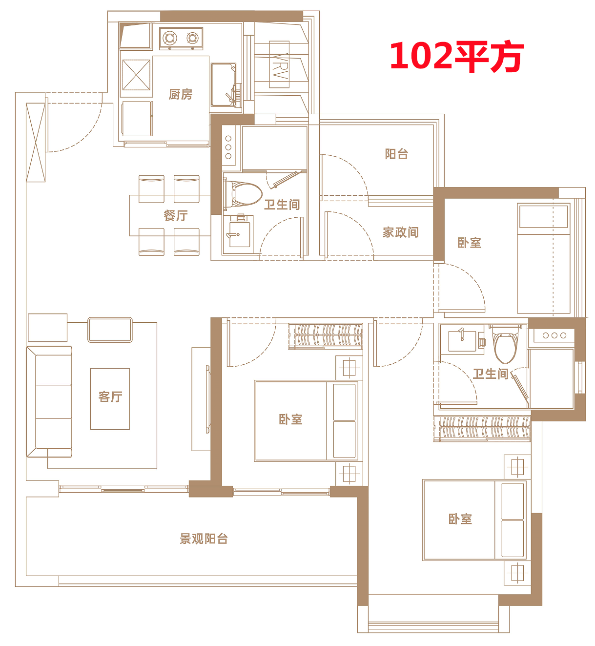 102㎡:俯瞰内外双园景水景江岸四房