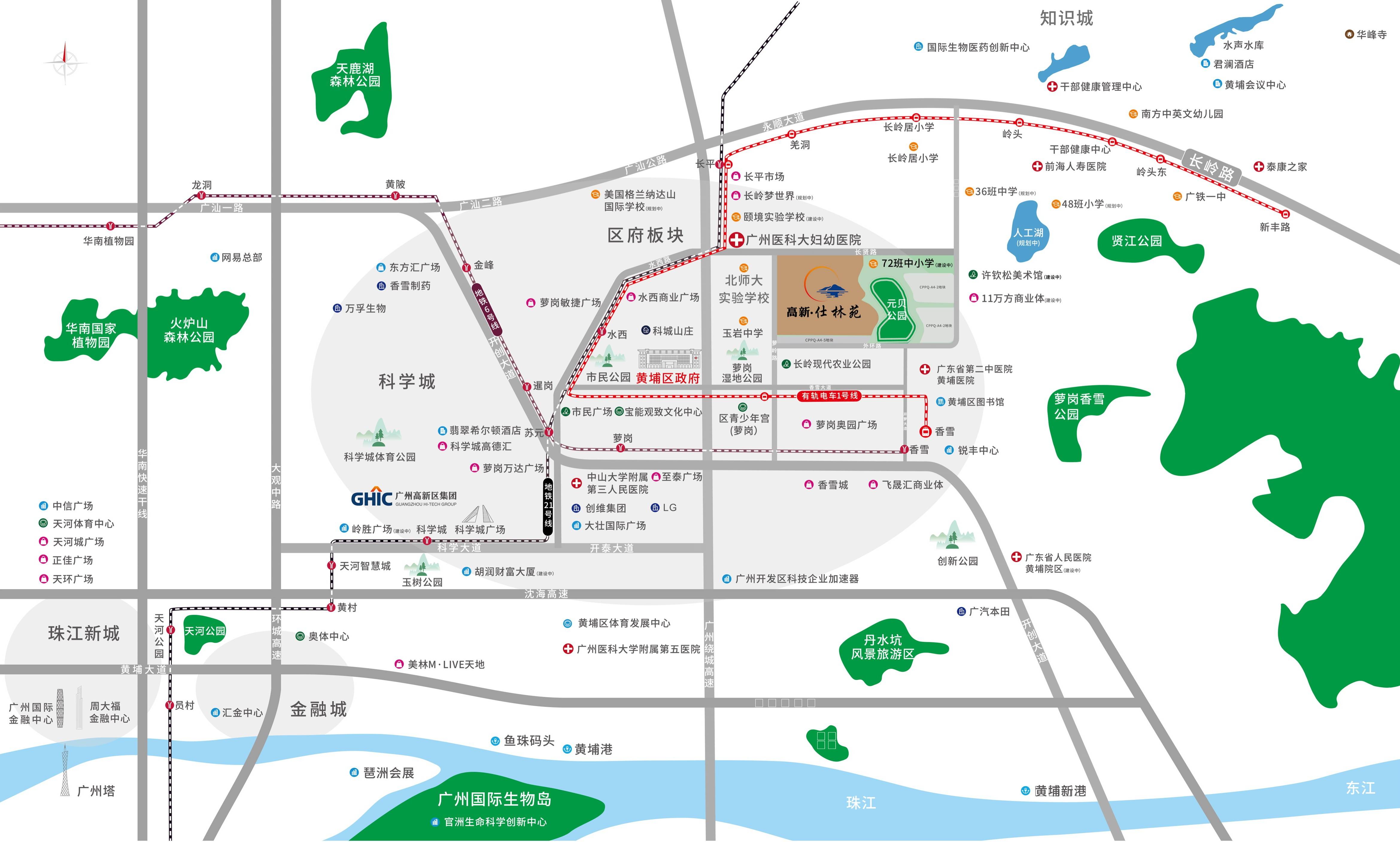 步行约 400 米有轨电车 1 号线羌洞站,1 站换乘 21 号线;约 800 米地铁 21 号线长平站,1 站黄埔区府(水西站)、2 站万达广场(苏元站)、5 站到天河(天河智慧城站);