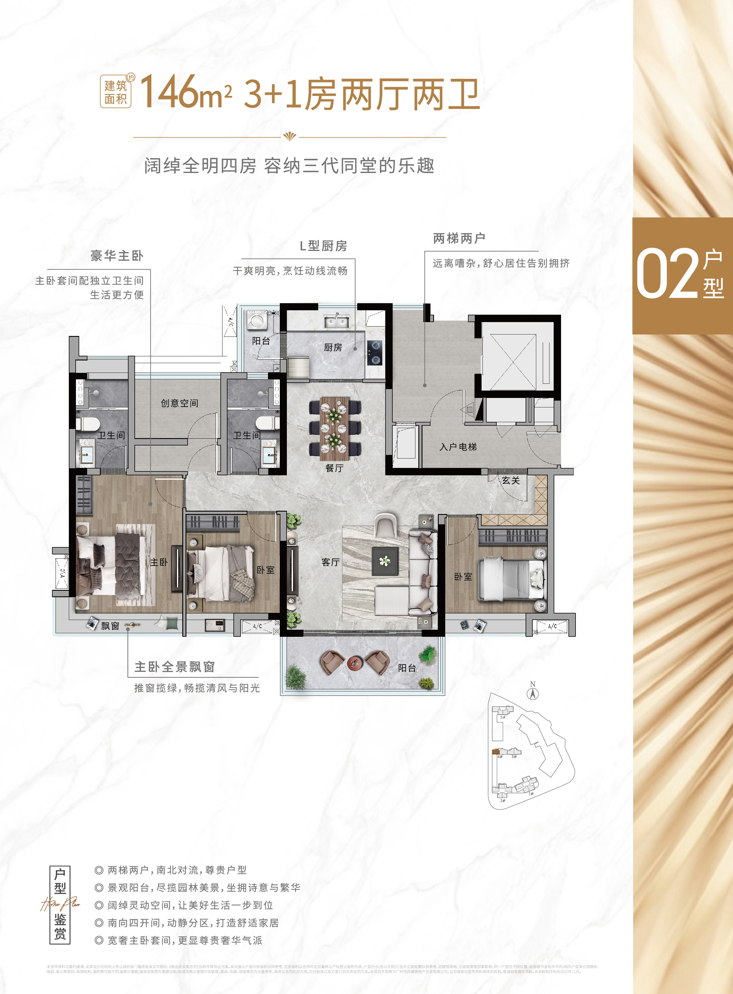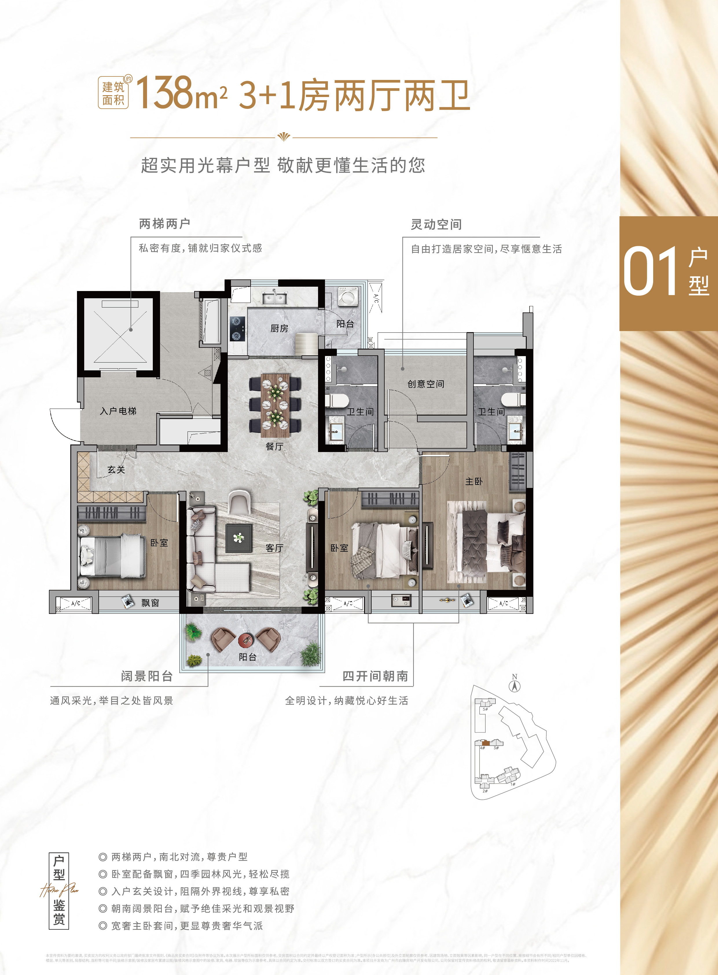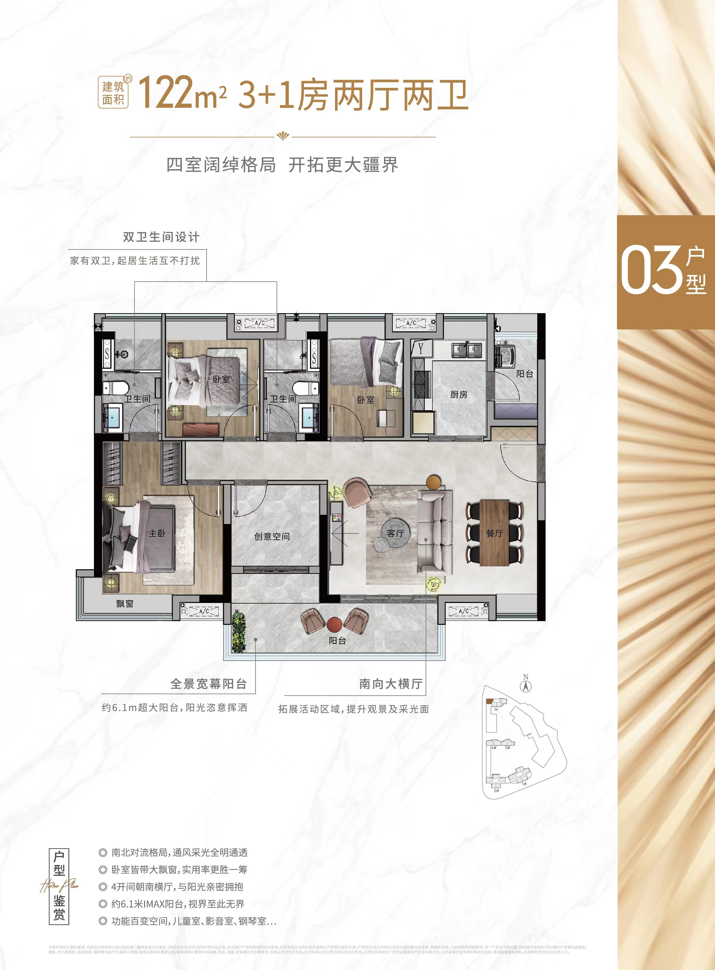 3:豪宅板式楼设计,户户纯南向,大面宽采光,南北通透,前后约70米楼间距,户户带园林景观。