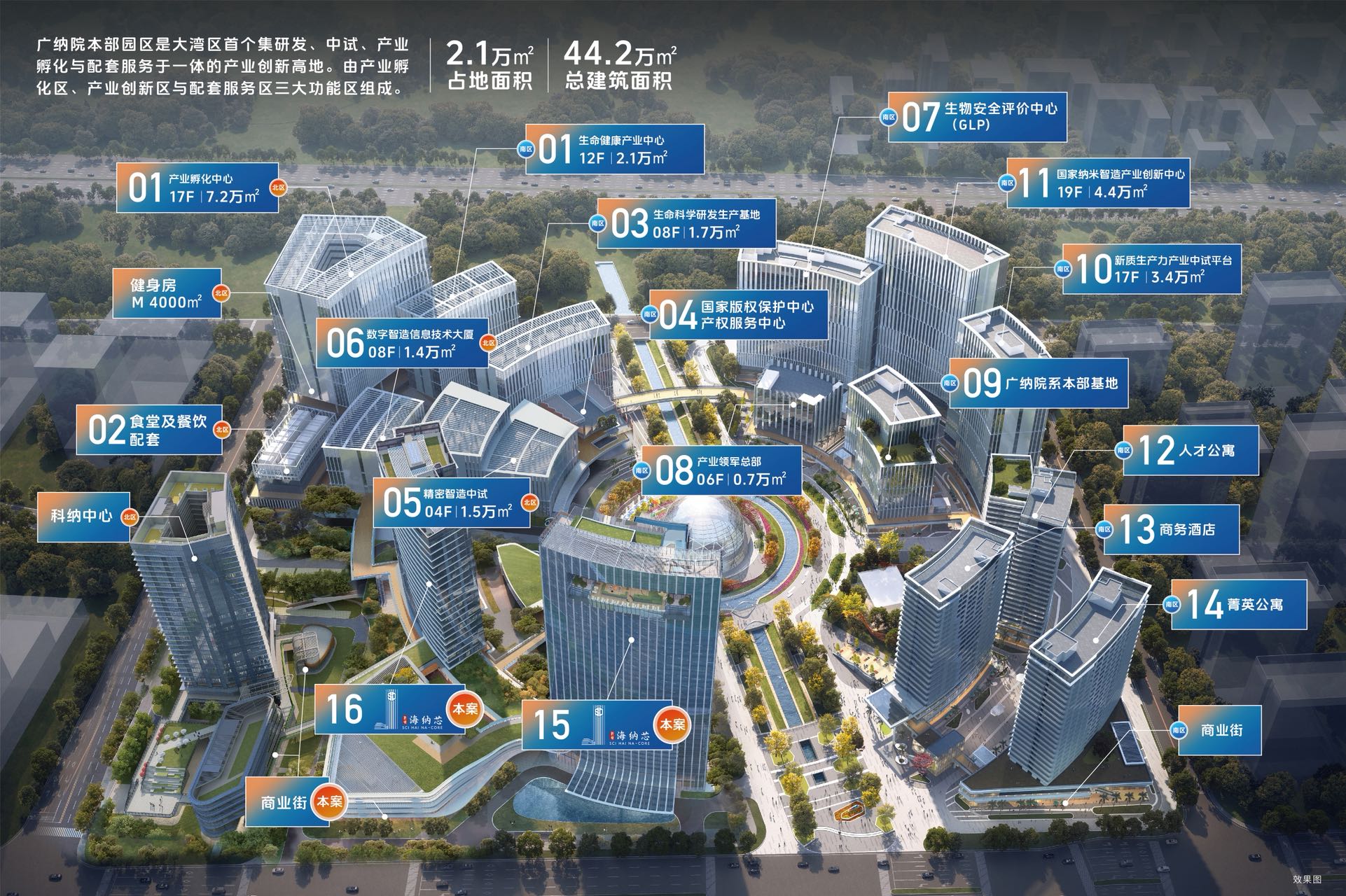 【城芯综合体范本 楼下约 1.3 万㎡轻奢商业】占地 9 万方,与一、二期广纳院地块充分融合,超宽楼间距和大面积绿 地,打造“立体城市公园”,大大提升了整个项目的环境品质。园区自带 4000 方高端健身馆,智慧自助餐厅、黄埔图 书馆和雅致咖啡厅等,生活配套完善。项目所在楼栋与科纳中心大楼二层连廊充分延申并贯通,串联 10000 ㎡口袋商 业。