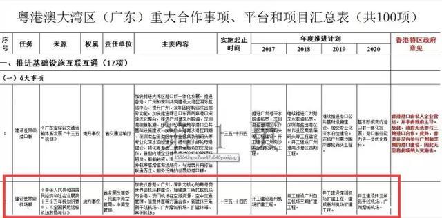 其三,最近流出的一份《粤港澳大湾区(广东)重大合作事项、平台和项目汇总表》,在这份文件中提出加快以香港、广州、深圳为核心的粤港澳世界级机场群建设,加强珠三角民航机场与香港、澳门机场在空域资源、空中交通管理、信息共享等方面合作,新建珠三角新干线机场,广州增城机场、扩建珠海、惠州机场等内容,并提出了具体的年度进度计划。
